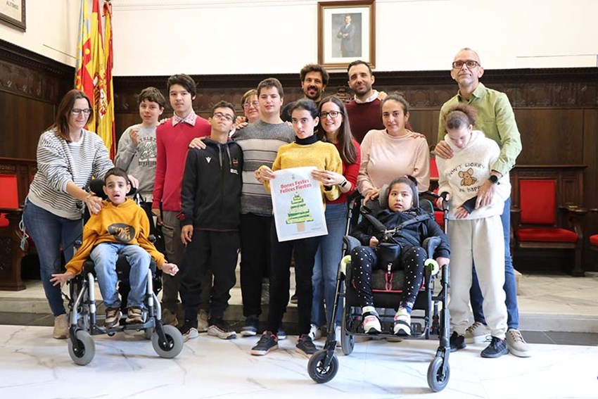 El alcalde de Sagunto, Darío Moreno, acompañado por el director de este centro saguntino de educación especial, Xavi Martínez, y una representación de familias del mismo han presentado este miércoles la propuesta elegida para estas navidades. Entre las personas usuarias que han asistido al acto no han faltado Alba y Gabi, a quienes corresponde el diseño.