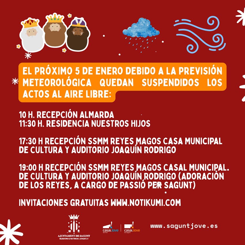 El Ayuntamiento de Sagunto ha decidido reubicar las cabalgatas y los tradicionales actos del 5 de enero para recibir SSMM los Reyes Magos. Por la mañana, el mal tiempo hace que se suspenda este año su llegada al puerto marítimo en barco. En cambio, sí que se mantienen durante la mañana las visitas reales en los barrios de Baladre y Almardà, así como a la residencia Nuestros Hijos.