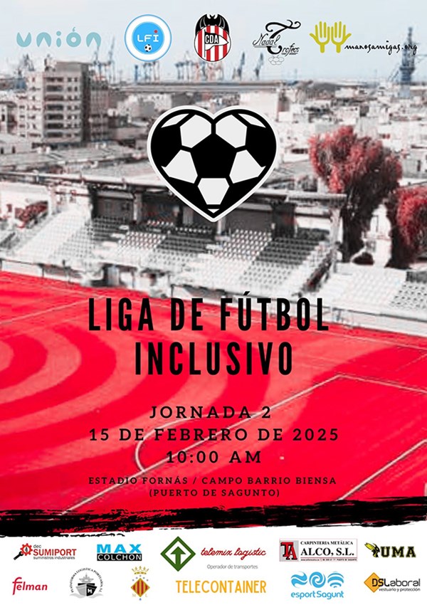 La Liga de Fútbol Inclusivo pasará por Sagunto este fin de semana. Este sábado, 15 de febrero, a partir de las 9:15 horas, se disputará la segunda jornada de esta competición tanto en el Estadio Municipal El Fornàs como en el Campo Municipal Barrio Biensa. Este evento está organizado por el CD Acero junto con la Asociación Manos Amigas y al Proyecto Ilunion, y cuenta con la colaboración del Ayuntamiento de Sagunto a través de su departamento de Actividad Física, Salud y Deportes.