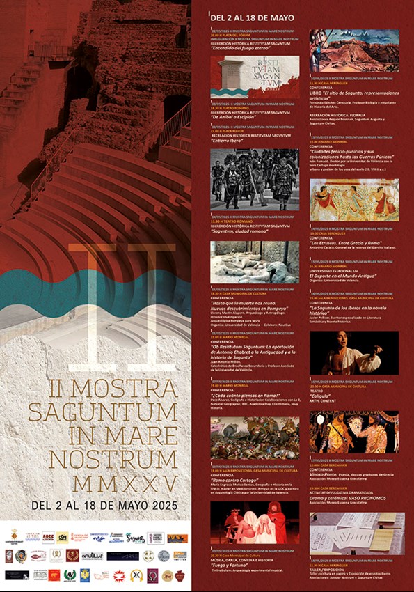Luego, el sábado 3 de mayo habrá talleres y actividades de las épocas íbera y romana de 11 a 13:30 horas en el entorno del Mercado Municipal y la plaza Cronista Chabret. Además, a las 18:30 horas en el Teatro Romano se representará la recreación De Aníbal a Escipión y, a las 21 horas en la plaza Mayor, el Entierro íbero. Estas jornadas acabarán el domingo 4 de mayo a las 11:30 horas en el Teatro Romano con Sagvntvm, municipio romano, una recreación en la que se leerá el manifiesto que recoge la herencia de enseñanzas y valores de la época y el trasfondo de la muestra.