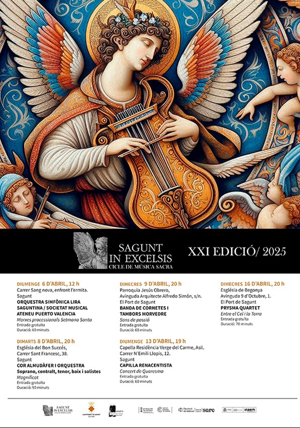La XXI edición del ciclo de música sacra Sagunt in Excelsis, que organiza la Concejalía de Cultura del Ayuntamiento de Sagunto, acaba mañana, miércoles 16 de abril. Será con el concierto Entre el cielo y la tierra, a cargo de Prysma Quartet, a las 20 horas en la iglesia Nuestra Señora de Begoña.