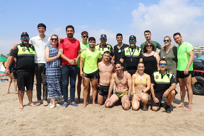 En esta simulación de salvamento han participado un equipo de socorristas y su coordinador, la policía local de playas, un patrón de embarcación, el servicio técnico sanitario y un piloto de dron. Cabe mencionar también la presencia del concejal de Playas, Roberto Rovira; y la concejala de Policía Local, María José Carrera.