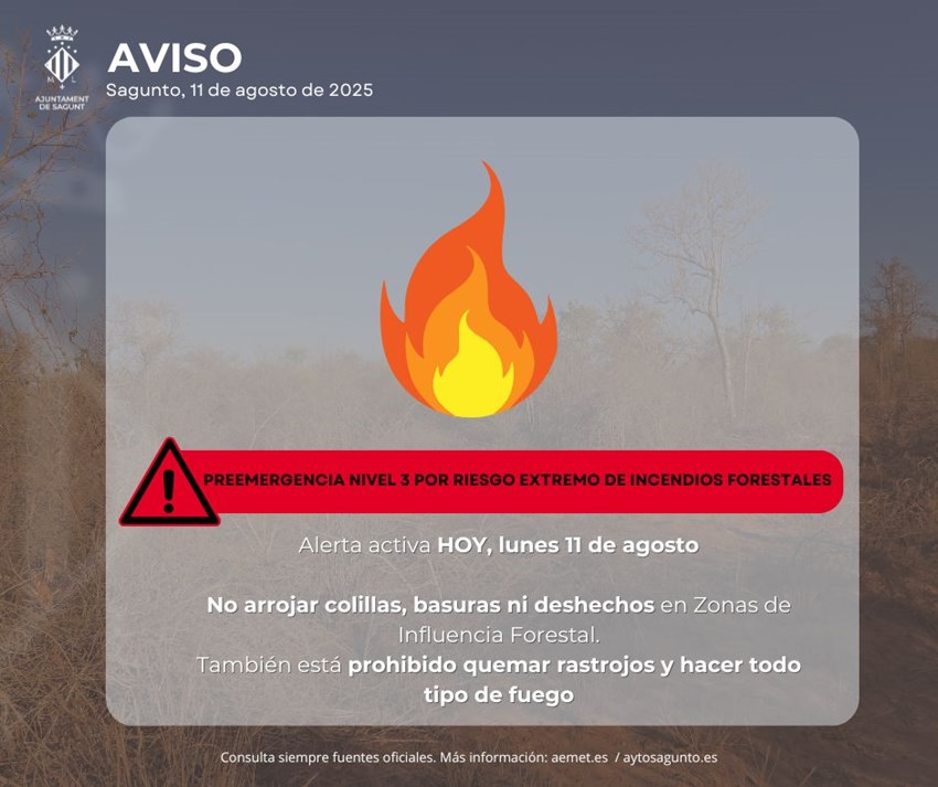 Asimismo, desde el Ayuntamiento de Sagunto se recuerda a la ciudadanía algunas de las recomendaciones que, por una mayor seguridad, cabe seguir en estos momentos de preemergencia por riesgo extremo de incendios tanto en zonas forestales como en una franja de 500 metros a su alrededor, como son extremar las precauciones con las colillas y fósforos e informarse en tiempo real de los avisos oficiales del Ayuntamiento de Sagunto, AEMET y el 112 CV.