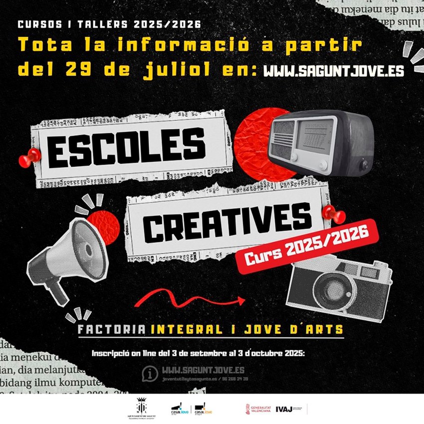 La gran mayoría de las acciones formativas de las Escuelas Creativas son de larga duración (de octubre de 2025 a mayo de 2026), pero también hay otros formatos más monográficos. Todos los talleres y cursos se impartirán en el Casal Jove de Sagunto, así como en el de Puerto de Sagunto.