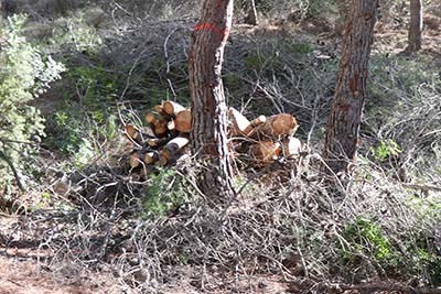 Actualmente, los trabajos en El Espartal están consistiendo en la limpieza del camino quitando la vegetación. Los restos vegetales gruesos se están apilando a pie de pista para su aprovechamiento posterior por parte de los vecinos. El resto del material vegetal más fino procedente de las cortas y podas se eliminará mediante astillado in situ para acelerar la incorporación de la materia vegetal al suelo.
