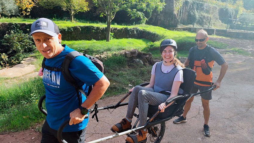 La asociación Cazaretos ha cedido una silla Joëlette a una persona con movilidad reducida para que pudiera disfrutar de la ruta junto al resto del grupo que ha conformado esta excursión de Alternatura a la Escuela. La silla Joëlette es una silla todoterreno con una sola rueda que posibilita disfrutar del senderismo y otras actividades en entornos naturales a personas con movilidad reducida.