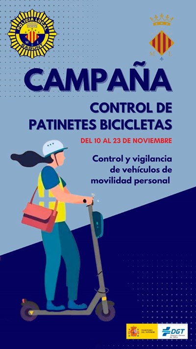 Hoy comienza una campaña para el control y la vigilancia del uso de vehículos de movilidad personal (VMP) organizada por la Policía Local del Ayuntamiento Sagunto. Esta iniciativa, dirigida a las personas usuarias de patinetes eléctricos u otro tipo de VMP, se desplegará en las calles del municipio hasta el 23 de noviembre con el objetivo de mejorar la seguridad vial en el tráfico de la ciudad.