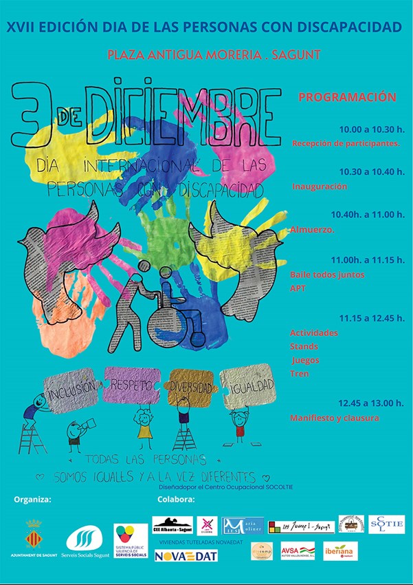 El Ayuntamiento de Sagunto, a través de la Concejalía de Servicios Sociales, celebra un año más el Día Internacional de las Personas con Discapacidad, que se conmemora el miércoles 3 de diciembre. Ese día a partir de las 10:30 horas se llevarán a cabo diversas actividades en la plaza de la Morería de Sagunto en la XXII edición de esta celebración.