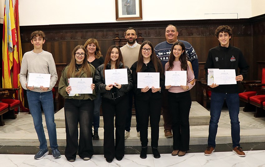 El alcalde de la ciudad, Darío Moreno; y el concejal de Educación, Raúl Palmero; acompañados por la primera teniente de alcalde, María José Carrera; han entregado unos diplomas otorgados por el Consistorio a modo de reconocimiento a cada uno de los estudiantes, así como el libro Desmemoriat de Berna Blanch, ganador del 26o Premio de Narrativa de los Ciutat de Sagunt 2024.