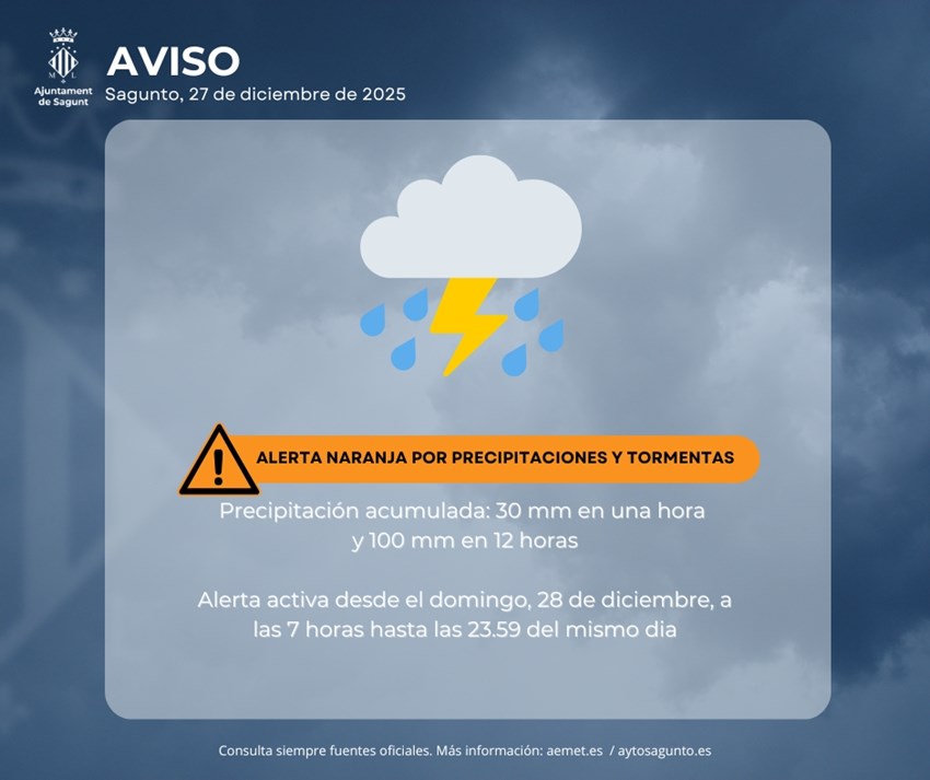 El 112 Comunidad Valenciana ha decretado una alerta naranja (riesgo importante) por intensas precipitaciones acompañadas de tormentas en Sagunto, así como en el conjunto de la provincia de Valencia. La alerta estará activa desde mañana, domingo 28 de diciembre, a las 7 horas, hasta las 23.59 del mismo día.