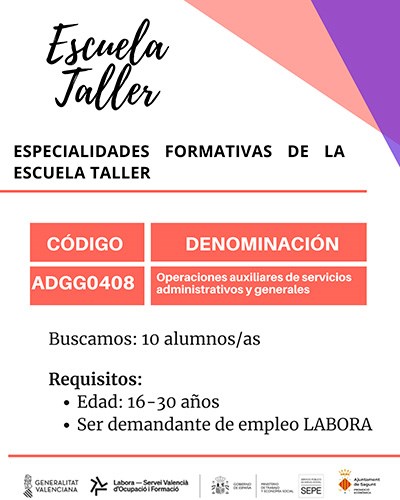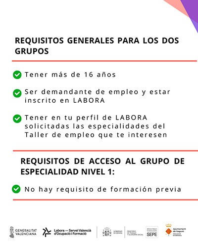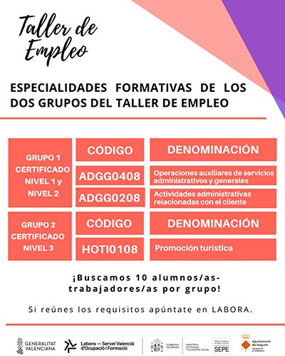 Este taller está formado por dos especialidades formativas, por lo que se divide en dos grupos. El primero, sobre servicios administrativos (Grupo 1) y, el segundo, sobre promoción turística (Grupo 2). El objetivo es que cada grupo esté integrado por 10 personas que cumplan los siguientes requisitos: tener más de 16 años, ser personas desempleadas y estar inscritas en una oficina de Espai Labora, tener un perfil de LABORA teniendo solicitadas las especialidades del Taller de Empleo que le interesen.