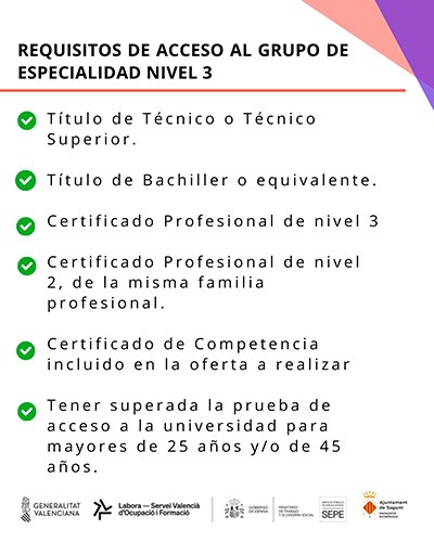 Para el Grupo 1 no es necesario tener formación previa. No obstante, para el Grupo 2 es requisito estar en posesión de alguna de las siguientes titulaciones: título de Técnico o Técnico Superior, Título de Bachiller o equivalente, certificado de Profesional nivel 3, certificado de profesionalidad de la misma familia o área profesional de nivel 2, certificado de Competencias clave nivel 3, cumplir el requisito de acceso a ciclos formativos de grado superior o las correspondientes pruebas de acceso, o tener superada la prueba de acceso a la universidad para mayores de 25 años y/o 45 años.
