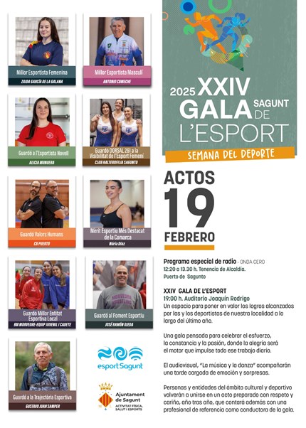 Por la tarde, a las 19 horas, se celebrará la XXIV Gala del Deporte de Sagunto en el Auditorio Joaquín Rodrigo. Se concederán un total de 9 premios y galardones a deportistas y clubes locales por sus méritos y logros alcanzados. Concretamente, se entregará el premio a Mejor Deportista Femenina a Zaida García, el premio a Mejor Deportista Masculino a Antonio Comeche, el galardón a la Deportista Novel a Alicia Munuera, el galardón DORSAL 216 a la Visibilidad en el Deporte Femenino al Club Halterofilia Sagunto, el galardón Valores Humanos al CB Puerto, el galardón al Mérito Deportivo Más Destacado de la Comarca a Nuria Díaz, el galardón a Mejor Entidad Deportiva Local al equipo juvenil y cadete del BM Morvedre, el galardón al Fomento Deportivo a José Ramón Ojeda, y el galardón a la Trayectoria Deportiva a Gustavo Juan Samper.