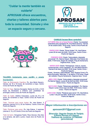 Las conferencias, con acceso libre y gratuito para el público general, y cuyo calendario ya ha empezado, se prolongarán hasta el verano. Así, el viernes 6 de marzo la psicóloga Ana María Navarro ofrecerá la charla Sobrepensar. Qué es, causas, consecuencias y cómo manejarlo, a partir de las 19:00 horas en el Centro Cívico Antiguo Sanatorio de Puerto de Sagunto. El miércoles 11 de marzo se abordará la temática Jóvenes y Salud Mental por parte de la psiquiatra Rosana Corral y el psicólogo y presidente de la asociación, Jaime Romualdo, a las 17:00 horas en el Hogar del Jubilado de El Puig de Santa María, en un acto que en esta ocasión organiza la Asociación Tyrius.