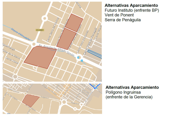 Ante la imposibilidad de estacionar en estas zonas, el Ayuntamiento de Sagunto habilitará cuatro solares como zonas de aparcamiento alternativas para este día. Tres de ellas estarán situadas alrededor de la avenida Arquitecto Alfredo Simón, en el extremo más próximo al cementerio, y la cuarta en un solar de la avenida Ojos Negros, a la altura de la Gerencia.