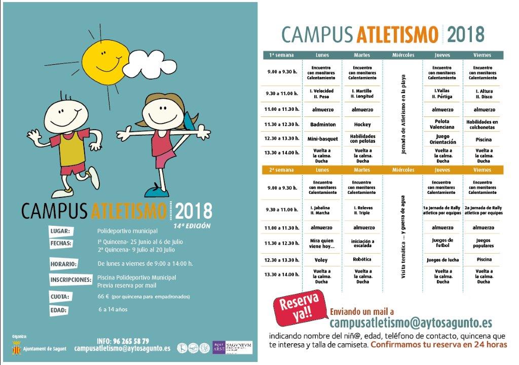 La reserva tiene que realizarse por mail, enviando el nombre del niño o niña, el teléfono de contacto, la quincena en la cual se desea inscribir y talla de camiseta a campusatletismo@aytosagunto.es. Una vez hecha la reserva por mail, la organización contestará con un correo con la confirmación de la reserva y la hora de inscripción, que se formalizará en el polideportivo municipal de Internúcleos. Además, se ofrecerán los plazos de pago del importe, que es de 66 euros.