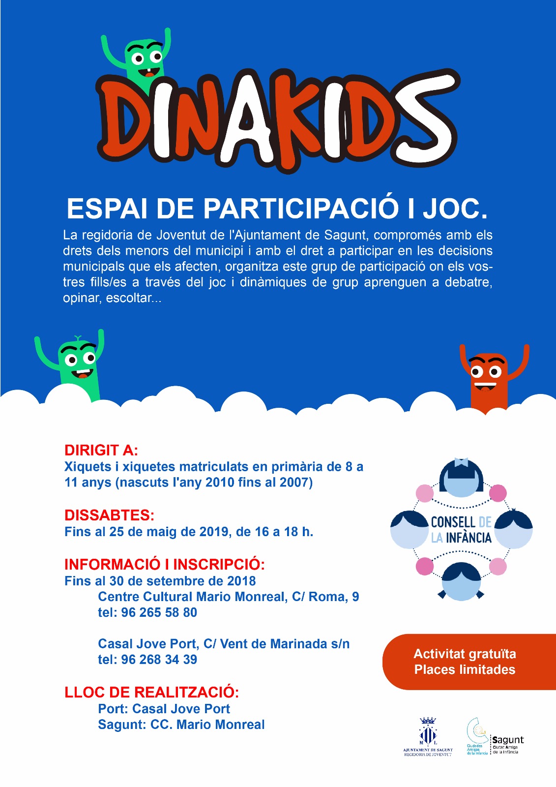 Este espacio es para niños y niñas matriculados de tercero a sexto de primaria, y comenzará su actividad el 20 de octubre. Se reúne los sábados de 16 h a 18 h en el Centro Cultural Mario Monreal y en el Casal Jove de Puerto de Sagunto. La actividad es gratuita y con plazas limitadas. El período de inscripción está abierto hasta el 30 de septiembre en el teléfono 96 265 58 80 (Centro Cultural Mario Monreal) y en el 96 268 34 39 (Casal Jove de Puerto de Sagunto).