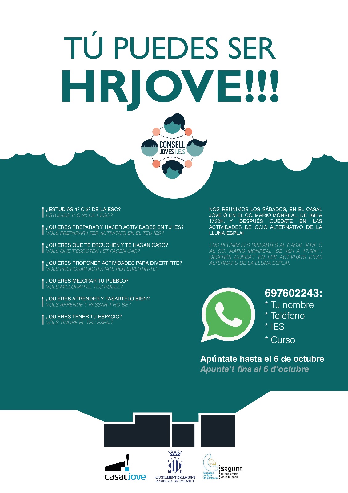 El espacio también sensibiliza y da a conocer la Convención de los Derechos del Niño, donde encuentran un espacio de aprendizaje, diversión y participación. Se reúne los sábados por la tarde de 16 h a 17.30 h en el Centro Cultural Mario Monreal y en el Casal Jove de Puerto de Sagunto, y empieza el 20 de octubre. Es una actividad gratuita, con plazas limitadas. El plazo de inscripción está abierto hasta el 6 de octubre enviando el nombre, teléfono, instituto y curso por WhatsApp al teléfono 697 602 243.