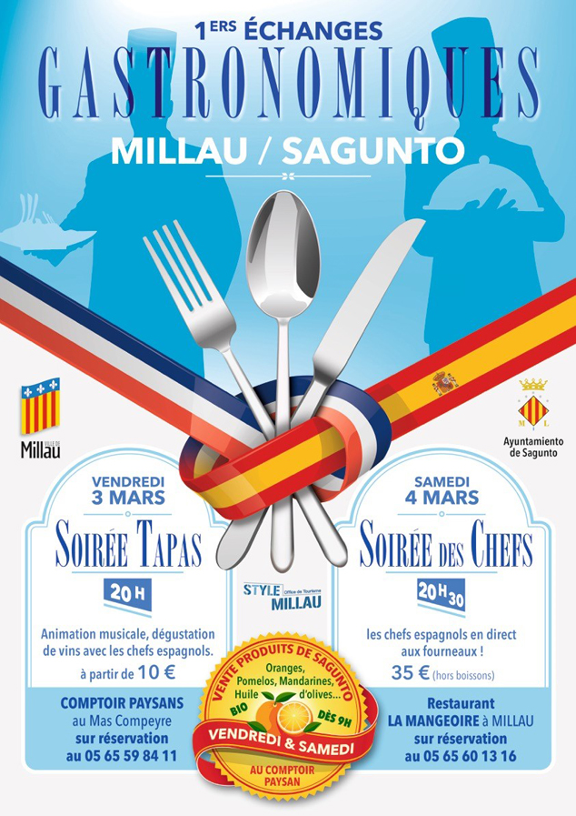“además de crear vínculos educativos y festivos, el tema turístico ha de desarrollarse. Esta es una buena forma de crear un flujo de posibles clientes, no sólo de ciudad a ciudad, sino de área a área; que la gente de Millau pueda conocer Valencia y viceversa, y que Sagunto pueda ser reconocido por todos”. La feria tendrá lugar los días 3 y 4 de marzo en Millau. El viernes 3 está previsto una feria de la tapa, en la que cada restaurante ofrecerá su tapa propia, y talleres de cocina y el sábado 4 se hará una recepción institucional y por la tarde un menú español en un restaurante de la ciudad de Millau. Todo esto estará musicalmente ambientado con dos músicos de Les Valls, con la música tradicional de la comarca, el tabal, la dolçaina, la guitarra, etc.