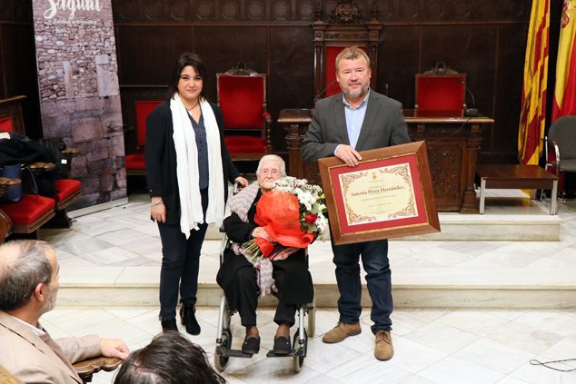 El Ayuntamiento de Sagunto ha rendido hoy homenaje a Antonia Pérez Hernández. A sus 106 años, Antonia vive en la calle La Paz, y hoy, rodeada de sus familiares y amigos, que se cuentan hasta 40, la han recibido el alcalde de Sagunto, Quico Fernández, y la delegada de Mayores, Natalia Antonino.