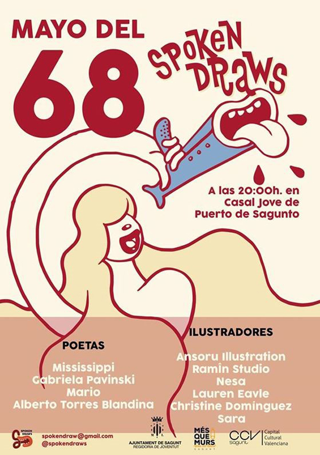 El mismo sábado tendrá lugar, en el Casal Jove, Spoken Draws, una fusión de poesía y artes plásticas en directo, a partir de las 20 h. En este espectáculo se combina literatura e ilustración, se recitan unos poemas que a su vez son ilustrados y proyectados en una pared y al final de cada evento, se sortean las ilustraciones entre el público.