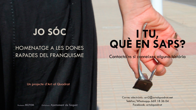 El proyecto Jo Sóc – Homenatge a les dones rapades nace de las dos artistas a modo de recuerdo “de una violencia oculta con falta de reconocimiento que, por el contrario, trató que las mujeres, que habían transgredido su papel de feminidad tradicional, recibieran un escarnio público que las degradaba y humillaba frente a toda la población”, según las componentes de Art al Quadrat. Entre los castigos, recuerdan Mònica y Gema, “se los rapaba el pelo, se los daba de beber aceite de ricino y eran paseadas por las calles céntricas del pueblo o la ciudad”. Además, el proyecto tiene como finalidad formar parte de una exposición sobre estas mujeres en el Museo de la Ilustración de Valencia (MUVIM) el próximo marzo de 2018.