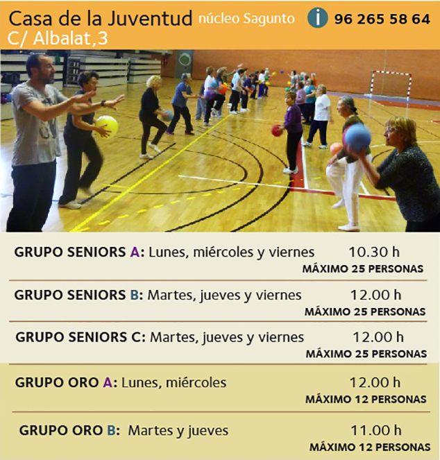 La delegación de Deportes del Ayuntamiento de Sagunto ha puesto en marcha la nueva temporada de sus dos iniciativas: Troba el Teu Temps y Activa’t. La primera ofrece actividades deportivas destinadas tanto a niños (de 3 a 6 años) como a adultos (de 14 a 60 años). La segunda de estas iniciativas, Activa’t, está destinada a ayudar a las personas mayores a mantener un estilo de vida saludable y realizar la actividad física necesaria para disfrutar de una buena salud.