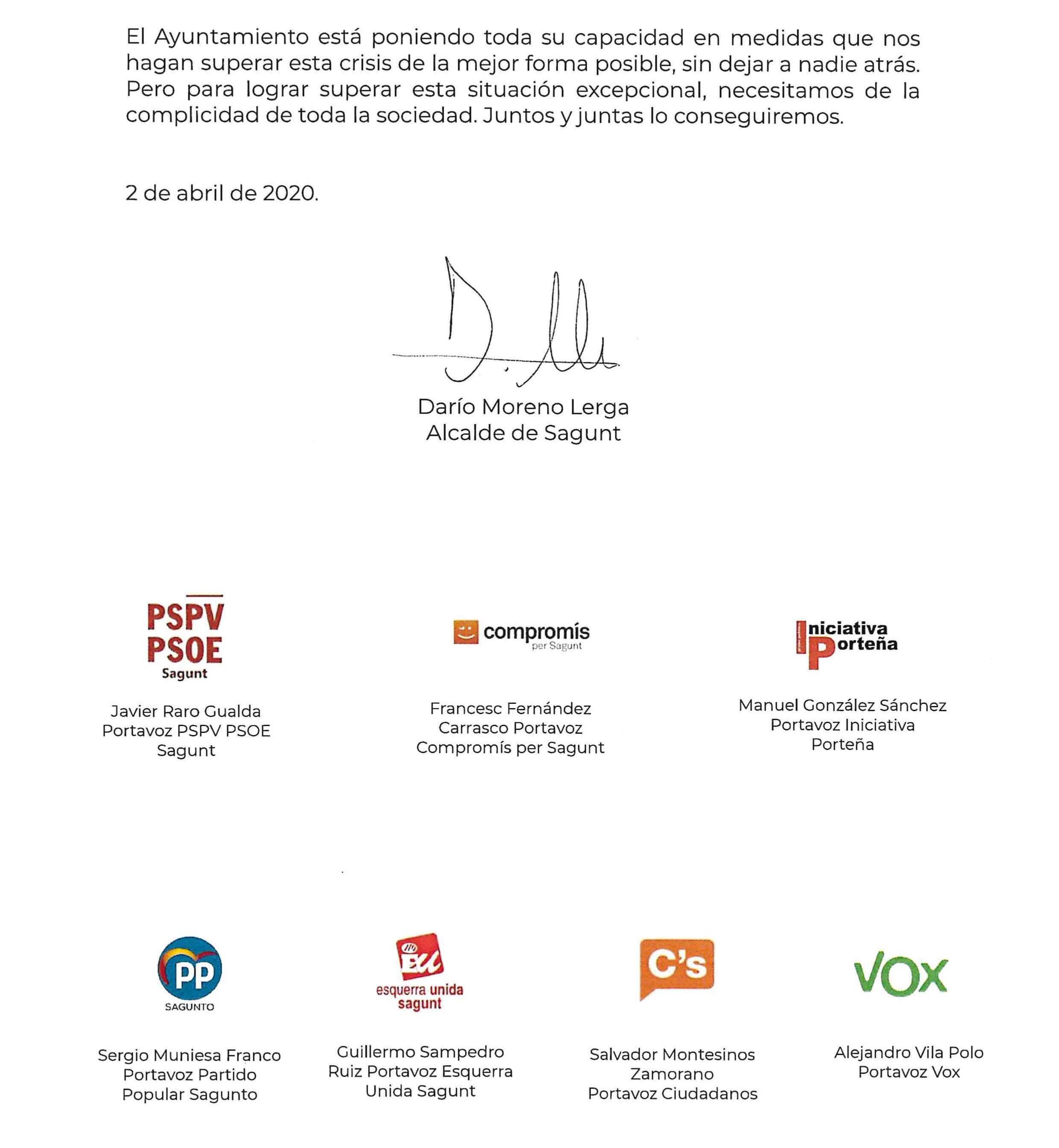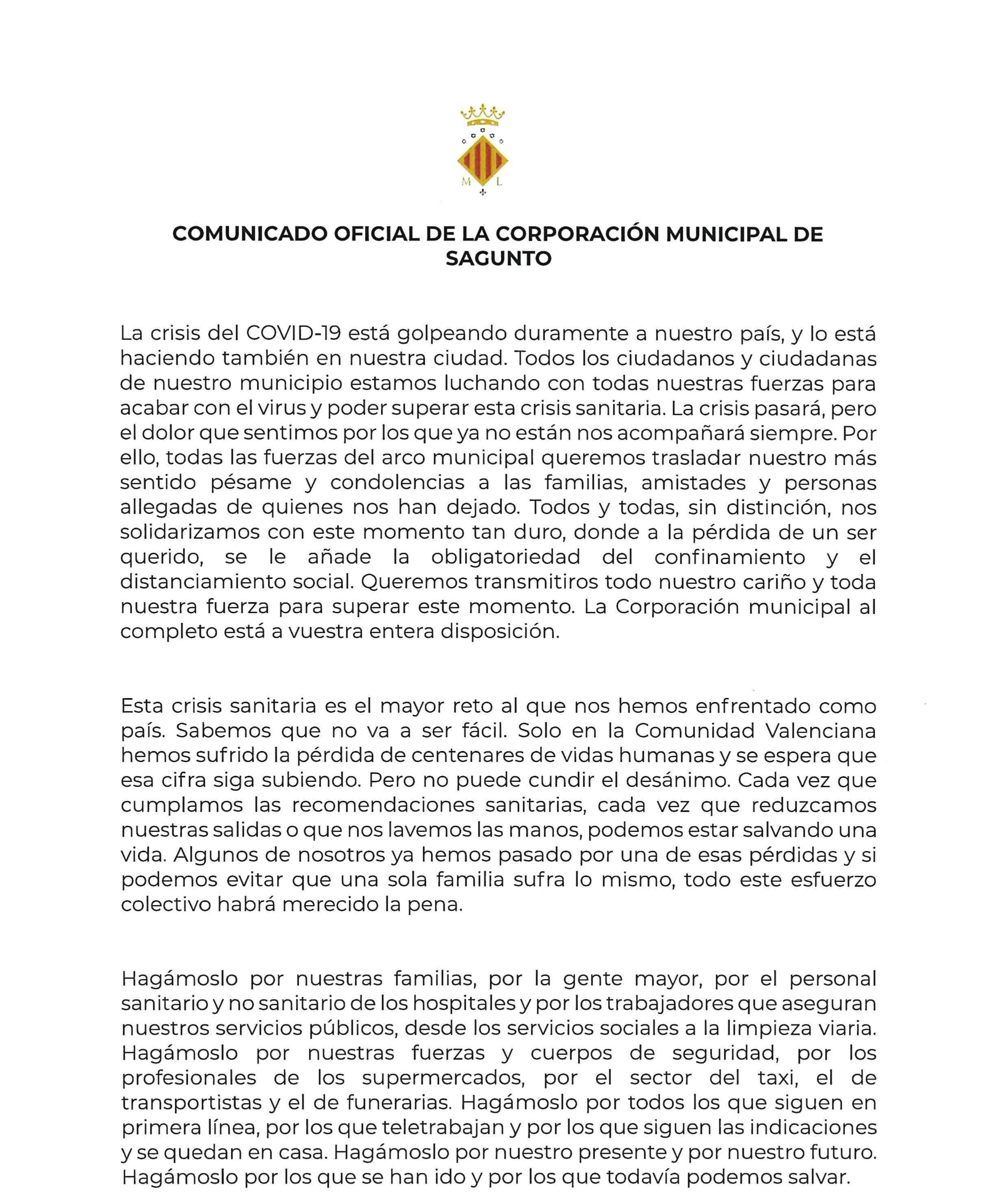 «La crisis del COVID-19 está golpeando duramente a nuestro país, y lo está haciendo también en nuestra ciudad. Todos los ciudadanos y ciudadanas de nuestro municipio estamos luchando con todas nuestras fuerzas para acabar con el virus y poder superar esta crisis sanitaria. La crisis pasará, pero el dolor que sentimos por los que ya no están nos acompañará siempre. Por ello, todas las fuerzas del arco municipal queremos trasladar nuestro más sentido pésame y condolencias a las familias, amistades y personas allegadas de quienes nos han dejado. Todos y todas, sin distinción, nos solidarizamos con este momento tan duro, donde a la pérdida de un ser querido, se le añade la obligatoriedad del confinamiento y el distanciamiento social. Queremos transmitiros todo nuestro cariño y toda nuestra fuerza para superar este momento. La Corporación municipal al completo está a vuestra entera disposición.