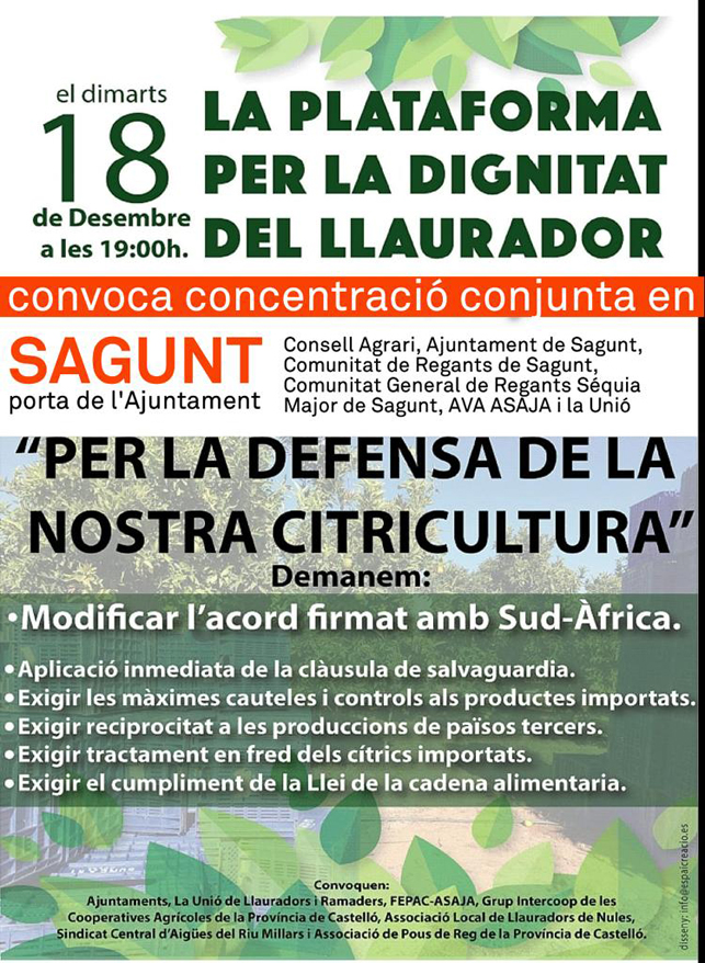 Una concentración conjunta donde el Consell Agrari, el Ayuntamiento, la Comunidad de Regantes de Sagunto, la Comunidad General de Regantes de Acequia Mayor de Sagunto, AVA ASAJA y la Unió de Llauradors i Ramaders pedirán que se modifique el acuerdo firmado con Sudáfrica, una aplicación inmediata de la cláusula de salvaguardia, exigir las máximas cautelas y controles a los productos importados, exigir reciprocidad a las producciones de países terceros, exigir el tratamiento en frío de los cítricos importados y exigir el cumplimiento de la Ley de la cadena alimentaria.