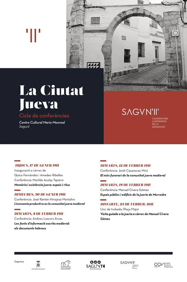 El Centro Cultural Mario Monreal acoge el 12 febrero a las 19 h la conferencia de Jordi Casanovas Miró El món funerari de la comunitat jueva medieval. Este evento está dentro del ciclo de conferencias ‘La Ciutat Jueva’ que la delegación de Cultura del Ayuntamiento de Sagunto y el Centro Arqueológico Saguntino han organizado con el fin de dar a conocer el patrimonio judío del municipio. Este ciclo de conferencias ahonda en el origen y los espacios de la cultura judía en el reino de Valencia y en concreto en Sagunto.