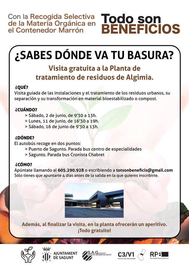 Continúa la campaña de Todo son beneficios para fomentar la recogida selectiva de materia orgánica, por lo que hay organizadas tres visitas guiadas más a las instalaciones de la planta de Algimia. Serán los días 2 y 16 de junio de 10.00 a 13.00 horas, y el lunes 11 de junio de 16.00 a 19.00 horas, con el objetivo de que la población tenga conciencia de dónde va y por qué proceso pasa la basura que tira cada uno. Las visitas anteriores han tenido una gran aceptación por parte de la ciudadanía.