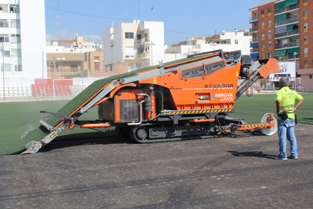 Las tareas que se están realizando en estos momentos son las de retirada del césped con maquinaria y personal especializado para su posterior aprovechamiento en otros emplazamientos. Las máquinas separan el caucho y la arena del césped para almacenarlo en rollos y clasificarlo según su posible utilidad.