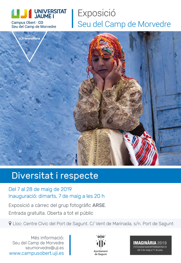 El 7 de mayo a las 20 h se inaugura la exposición Diversitat i respecte a cargo del Grupo Fotográfico ARSE que por primera vez participa en el proyecto IMAGINARIA 2019. Esta exposición que estará abierta hasta el 28 de mayo se realizará en la sala de exposición del Centro Cívico del Antiguo Sanatorio de Puerto de Sagunto. Está organizada por la Universitat Popular del Ayuntamiento de Sagunto y la Universitat Jaume I en colaboración con el Grupo Fotográfico ARSE. La entrada es gratuita y estará abierto a todo el público.