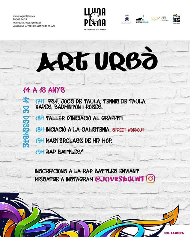 Por otro lado, a las 19 horas empezará la masterclass de hip hop y la rap battle, una batalla rapeante donde tendrán que meter a prueba su capacidad de improvisación ante un jurado. Desde la organización se promueve la utilización de un lenguaje no-sexista ni xenófobo donde la creatividad, la rima y el flow serán los aspectos más valorados. Además, el ganador o ganadora formará parte del jurado de la siguiente batalla de gallos que tendrá lugar el día 28 de diciembre durante una jornada muy especial que se prepara para las fiestas navideñas. Ningún destacar, la buena acogida que ha tenido esta iniciativa que nace de los intereses de los jóvenes y las jóvenes del municipio.