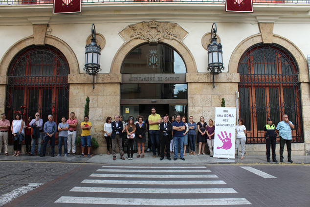 El Ayuntamiento de Sagunto, mediante la delegación de Igualdad, ha convocado un minuto de silencio esta mañana por los presuntos asesinatos machistas ocurridos este fin de semana en Sant Martí (Barcelona) y Ciudad Lineal (Madrid). Miembros de la Corporación Municipal, del funcionariado y de la ciudadanía han condenado y repulsado estos hechos en las puertas del Consistorio, de la Tenencia de Alcaldía de Puerto de Sagunto, en el edificio de Camí Reial 65 y en el Centro Cívico Antiguo Sanatorio.