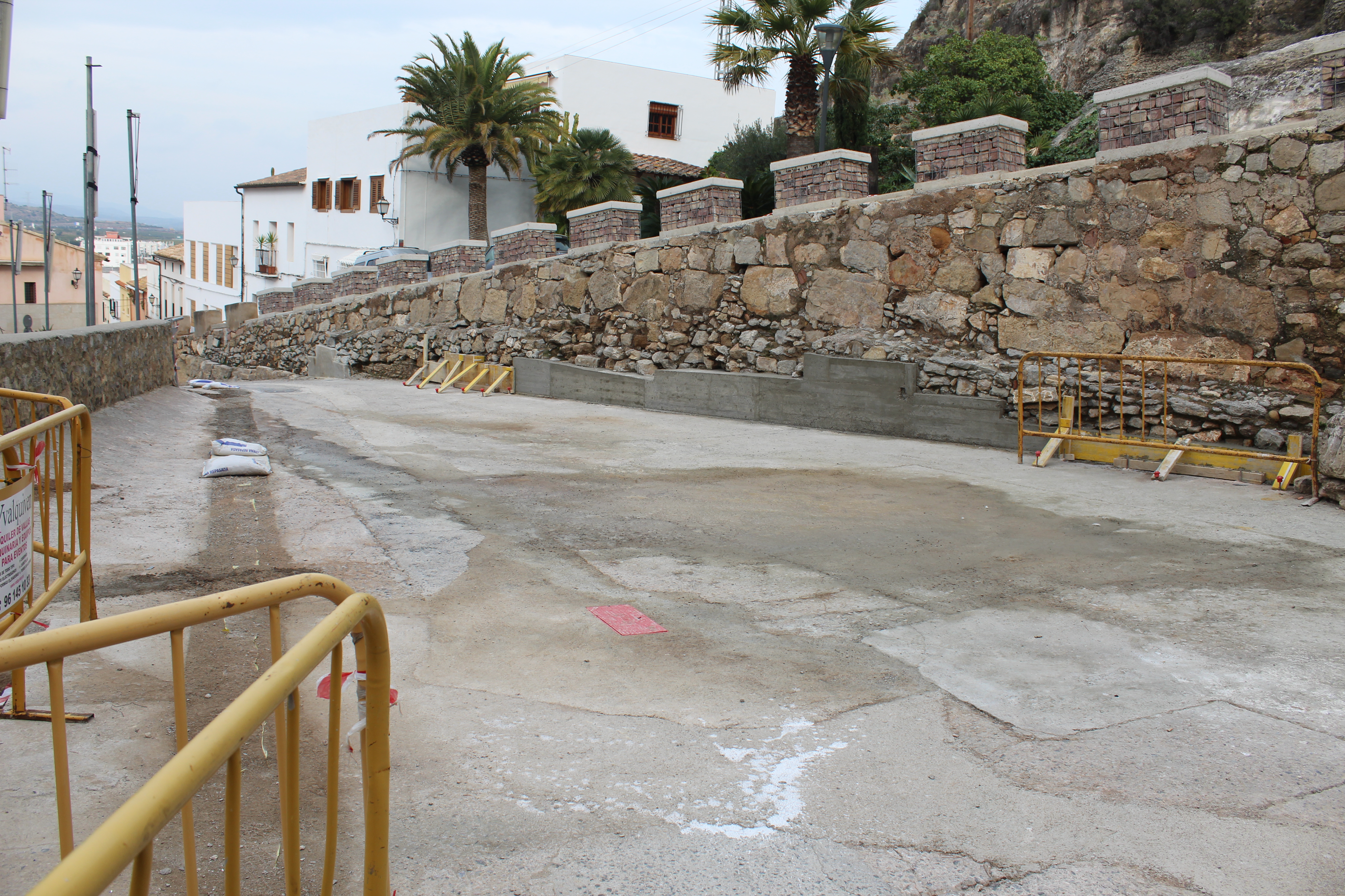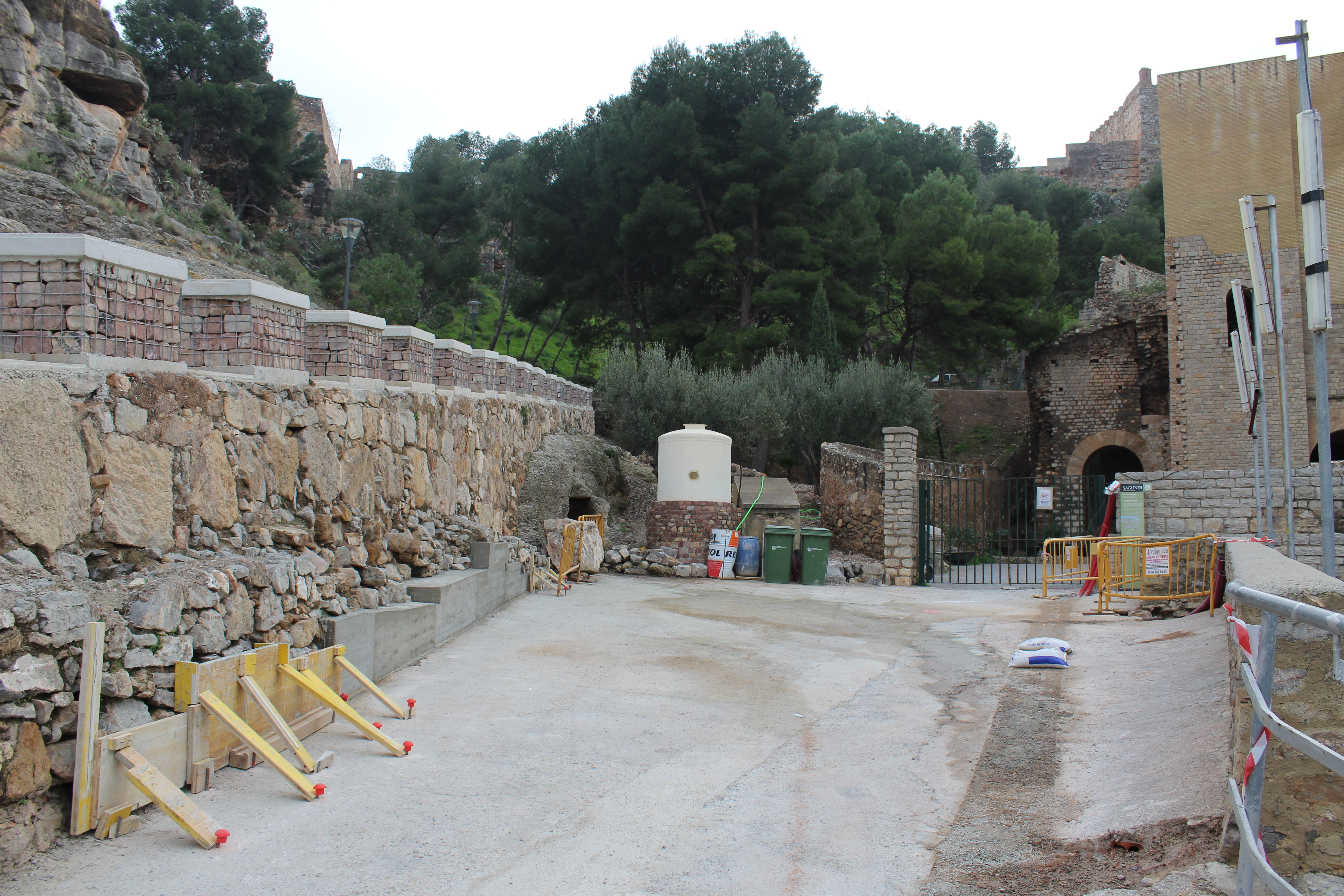 En cuanto a la primera, se trata de una mejora en la plaza que da acceso al Teatro Romano a la cual se accede a través del carrer Vell del Castell, con la implantación de un nuevo pavimento, el cual se adoquinará y reemplazará al actual hormigón que se encuentra en un estado bastante deteriorado. En este sentido, el concejal de Contratación, Pepe Gil, ha declarado que “en el plan de ocupación y con el EMCORP se han adoquinado caminos, se han mejorado accesos al Castillo y ahora, con las obras que se están acometiendo en el acceso que va desde la calle Castell hasta el Teatro Romano, se adoquinará el pavimento y se eliminarán elementos que son discordantes”. Estos elementos que producen un impacto visual desagradable, son unos depósitos de agua que actualmente se encuentran totalmente obsoletos. Estos serán sustituidos por un equipo de bombeo directo sobre la red dotando, de este modo, de agua potable al Teatro Romano y al Castillo. La duración estimada de dicha obra es de tres meses finalizándose, si los plazos se cumplen, el 29 de marzo de 2017. El presupuesto de ejecución de esta obra asciende a 103.600 euros aproximadamente, de los cuales el consistorio únicamente aporta 42.350 euros para costear los materiales necesarios. El resto de costes, relacionados con la mano de obra, corren a cargo del SERVEF, quien concedió una subvención a finales de 2016.