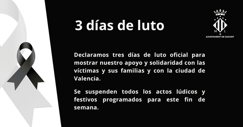 El Ayuntamiento de Sagunto ha decretado tres días de luto oficial tras el incendio sucedido en dos edificios de Campanar (Valencia) en la tarde del 22 de febrero y, por tanto, se suspenden todas las actividades lúdicas y festivas que estaban programadas para estos días.
