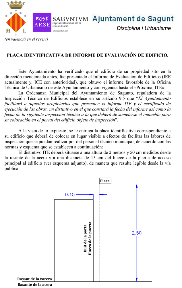 La delegación de Urbanismo del Ayuntamiento de Sagunto pone en marcha el proceso de entrega de las placas identificativas ITE (Inspección Técnica de Edificios) que deberán colocarse en el lugar exacto que se indica tal y como se observa en el archivo adjunto más abajo. Estas placas se otorgarán tras la verificación de los edificios según el Informe de Evaluación de Edificios presentado al ayuntamiento por los propietarios.