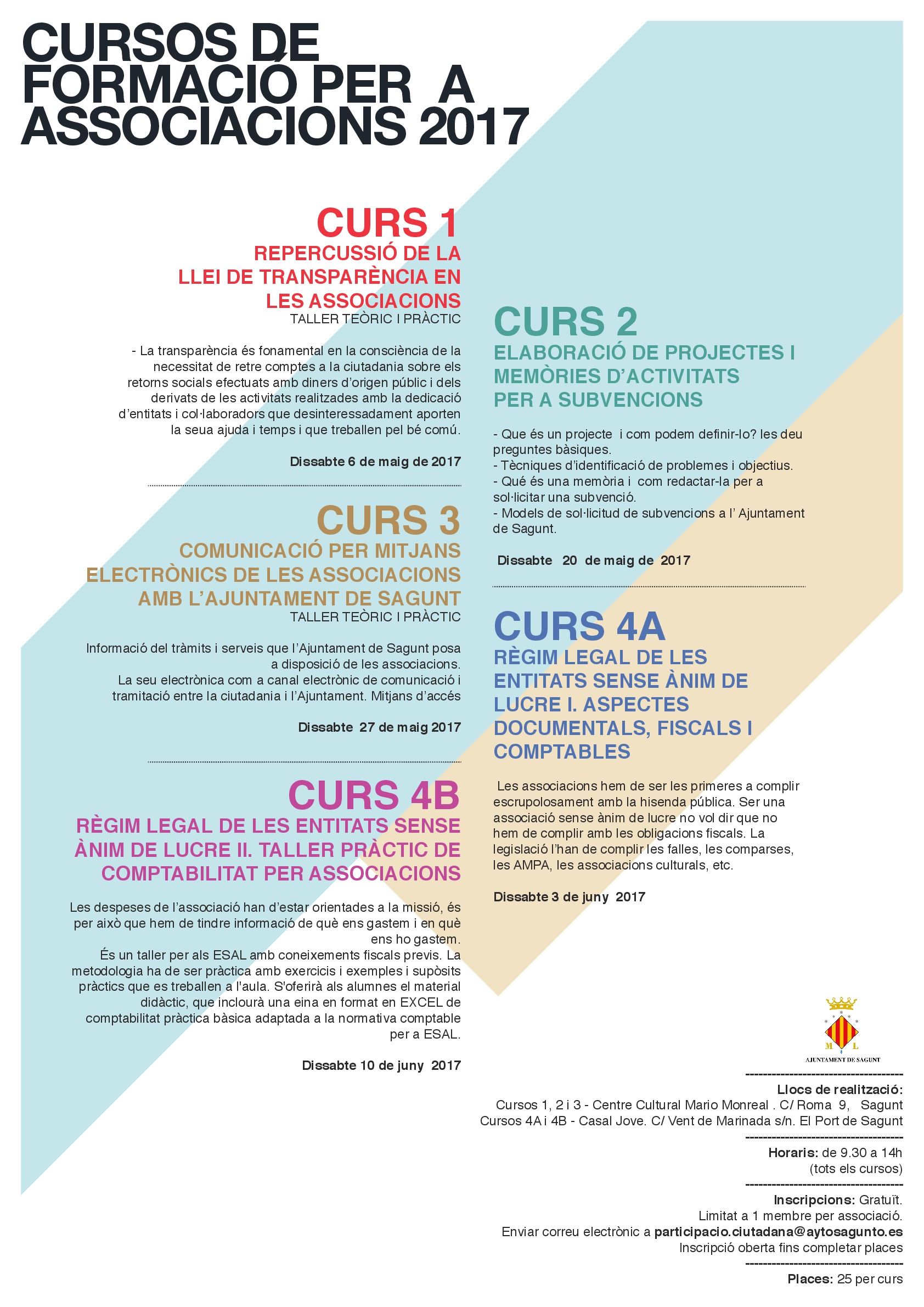 El área de Participación Ciudadana del Ayuntamiento de Sagunto ha anunciado la oferta de cursos de formación para asociaciones 2017. La oferta está compuesta por un total de cuatro cursos, el último de ellos desarrollado a lo largo de dos sesiones, que tendrán lugar a partir del próximo mes de mayo y durante cinco fines de semana. Por un lado, los cursos 1,2 y 3 tendrán lugar en el Centro Cultural Mario Monreal de Sagunto, mientras que las dos sesiones del curso 4, tanto 4A como 4B, serán en el Casal Jove de Puerto de Sagunto. El horario de los cursos será de 9.30 a 14 horas.