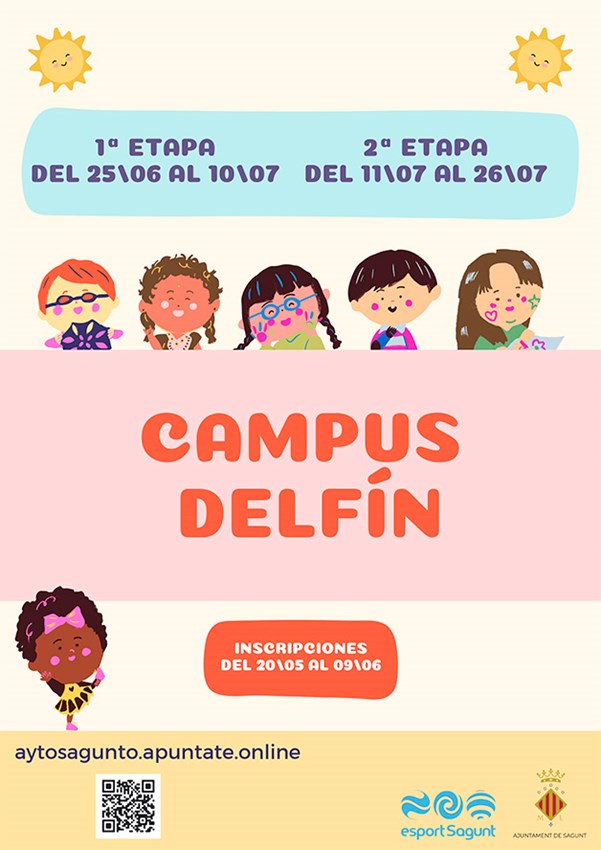 Para la vigesimosegunda edición del Campus Delfín de la concejalía de Actividad Física, Salud y Deportes se ofertarán 400 plazas, al igual que en la edición del 2023. La mitad estarán destinadas a la opción sin comedor, y la otra mitad a la opción con comedor. Las inscripciones comenzarán el 20 de mayo a las 9 horas y finalizarán el 9 de junio en la web https://aytosagunto.apuntate.online/pio/.