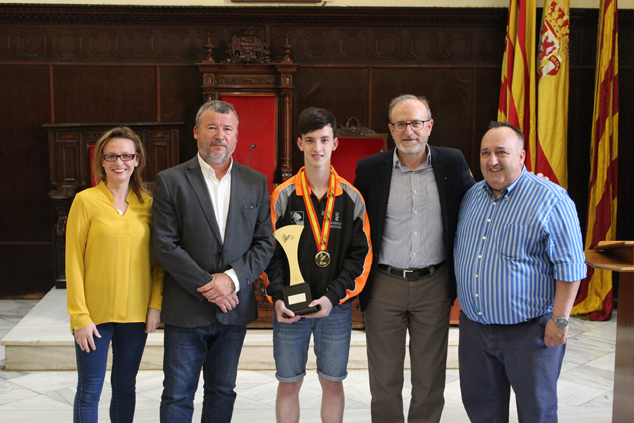El Salón de Plenos del Ayuntamiento de Sagunto acogió el pasado viernes, 11 de mayo, la recepción del deportista local Iván Caballero Torres. El motivo de esta recepción fue la proclamación de Campeón de España de Tenis de Mesa por Equipos, en la categoría cadete. A la recepción asistieron el deportista, Iván Caballero, con su familia, así como el alcalde de Sagunto, Quico Fernández; y el concejal de Deportes, Miguel Chover.