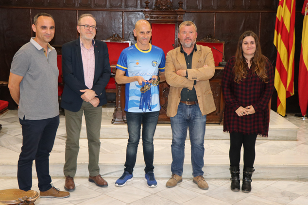 El alcalde de Sagunto, Quico Fernández, el concejal de Deportes, Miguel Chover, y la concejala María Giménez recibieron ayer en el salón de plenos del consistorio de la ciudad al nadador local Víctor Moreno donde le hicieron entrega de la insignia de la ciudad tras proclamarse triple oro nacional en el II Campeonato de España de Fondo celebrado en Vitoria.