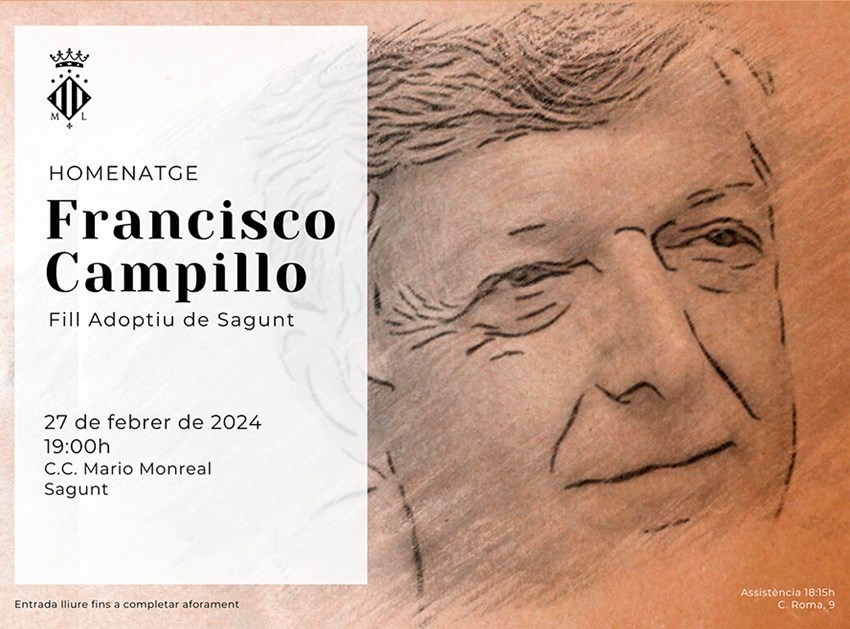 En el Pleno Extraordinario celebrado el pasado 29 de enero la Corporación Municipal del Consistorio de Sagunto decidió otorgar por unanimidad el título de Hijo Adoptivo de la Ciudad de Sagunto a Francisco de Paula Campillo. Este reconocimiento es la mayor condecoración que el Ayuntamiento puede conceder a las personas nacidas fuera del municipio y posee el mismo rango y distinción que el título de Hijo/a Predilecto/a, tal y como se especifica en los artículos 4 y 5 del actual Reglamento de Honores y Distinciones.