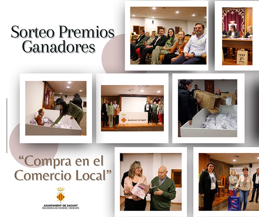 La Concejalía de Comercio y Mercados celebró ayer el sorteo de los premios de la Campaña de Promoción del Comercio Local en el Consell Local Agrari. Los premiados fueron recompensados con tres bonos de 1.000 euros y seis de 500 euros para comprar en los comercios adheridos a esta iniciativa, cuyo eslogan es ‘Invierte en confianza’. Cabe mencionar que a este acto asistió la concejala de Comercio y Mercados, Natalia Antonino, asociaciones de comerciantes y una representación de la Federación Junta Fallera de Sagunto.