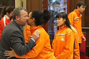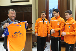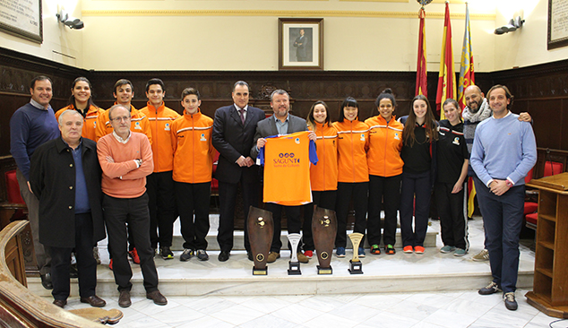El alcalde de Sagunto, Quico Fernández, y el delegado de Deportes, Miguel Chover, han recibido en el salón de plenos del Ayuntamiento a los jugadores y jugadoras del Fertiberia Balonmano Puerto de Sagunto y el Balonmano Morvedre para entregarles la insignia con el escudo la ciudad y felicitarles por su gran trabajo en el Campeonato de España de Selecciones Autonómicas, disputado en la ciudad catalana de Blanes.