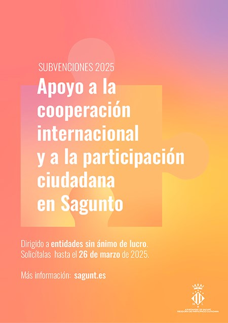 El Ayuntamiento de Sagunto, a través de la Concejalía de Participación Ciudadana, ha abierto el período de solicitud de dos nuevas convocatorias de subvenciones para el año 2025. Estas ayudas están dirigidas a entidades sin ánimo de lucro que trabajen en pro de la participación ciudadana y la cooperación internacional, con el objetivo de fortalecer el tejido asociativo y apoyar iniciativas que contribuyan al bienestar común tanto en el ámbito local como en el global.