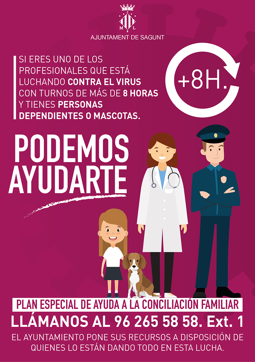 El Ayuntamiento de Sagunto ha puesto en marcha un plan de conciliación familiar para los colectivos profesionales que trabajan a diario en frenar la crisis sanitaria provocada por el COVID-19. Esta iniciativa, destinada a ayudar en el cuidado de niños y niñas, otras personas dependientes y mascotas, tiene como objetivo favorecer que colectivos sanitarios, fuerzas y cuerpos de seguridad puedan realizar su trabajo en mejores condiciones.