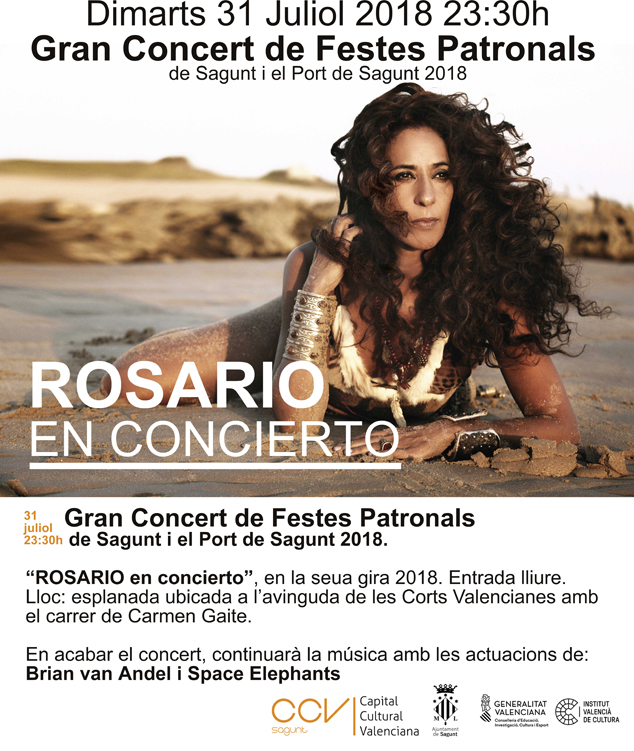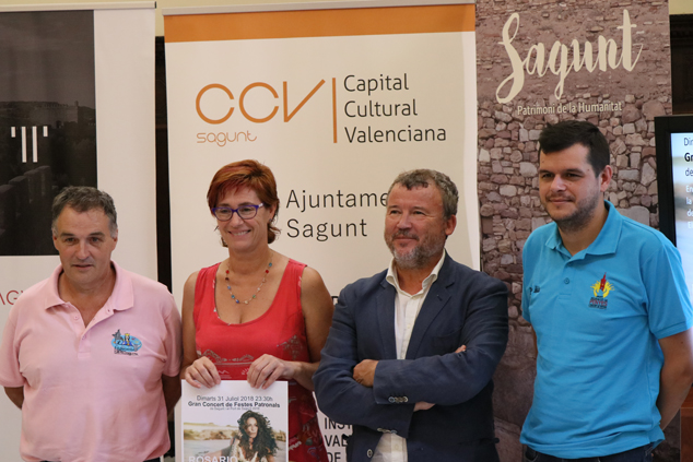 Hoy ha tenido lugar la presentación de las fiestas patronales de Sagunto por parte del alcalde, Quico Fernández, y de la concejala de Fiestas, Assumpció Moll. Las fiestas patronales de los dos núcleos urbanos de la ciudad tienen este año un punto más de unión: el concierto de Rosario Flores. La cantante actuará el martes 31 de julio en la zona próxima al centro comercial L’Epicentre como colofón de las fiestas de Sagunto y comienzo de las de Puerto de Sagunto desde las 23.30 horas. Tras el concierto, continuará la música con las actuaciones de Brian Van Andel y Space Elephants.