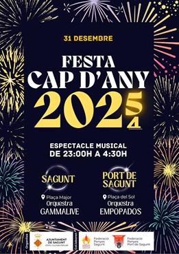La concejalía de Fiestas y Cultura Popular ha programado actividades para Nochevieja en los núcleos de Sagunto y de Puerto de Sagunto. Esta programación se ha hecho con la colaboración de la Asociación Cultural Penyes de Festes Patronals de Sagunt y de la Federación de Peñas de Puerto de Sagunto. Los espectáculos musicales comenzarán a las 12 de la noche del martes 31 y acabarán a las 4.30 horas de la madrugada del miércoles 1 de enero. En Sagunto actuará la orquesta GAMMALIVE en la plaza Mayor, y en Puerto de Sagunto lo hará la orquesta EMPOPADOS, en la plaza del Sol.