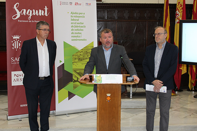 El Ayuntamiento de Sagunto y la Conselleria de Economía Sostenible, Sectores Productivos, Comercio y Trabajo han presentado hoy el programa de ayudas financiado con los fondos FEAG de la Unión Europea y de la Generalitat Valenciana. Se trata de una iniciativa para la reinserción laboral en el sector de vehículos de motor, remolques y semirremolques, que beneficia sobre todo a los extrabajadores de Bosal.